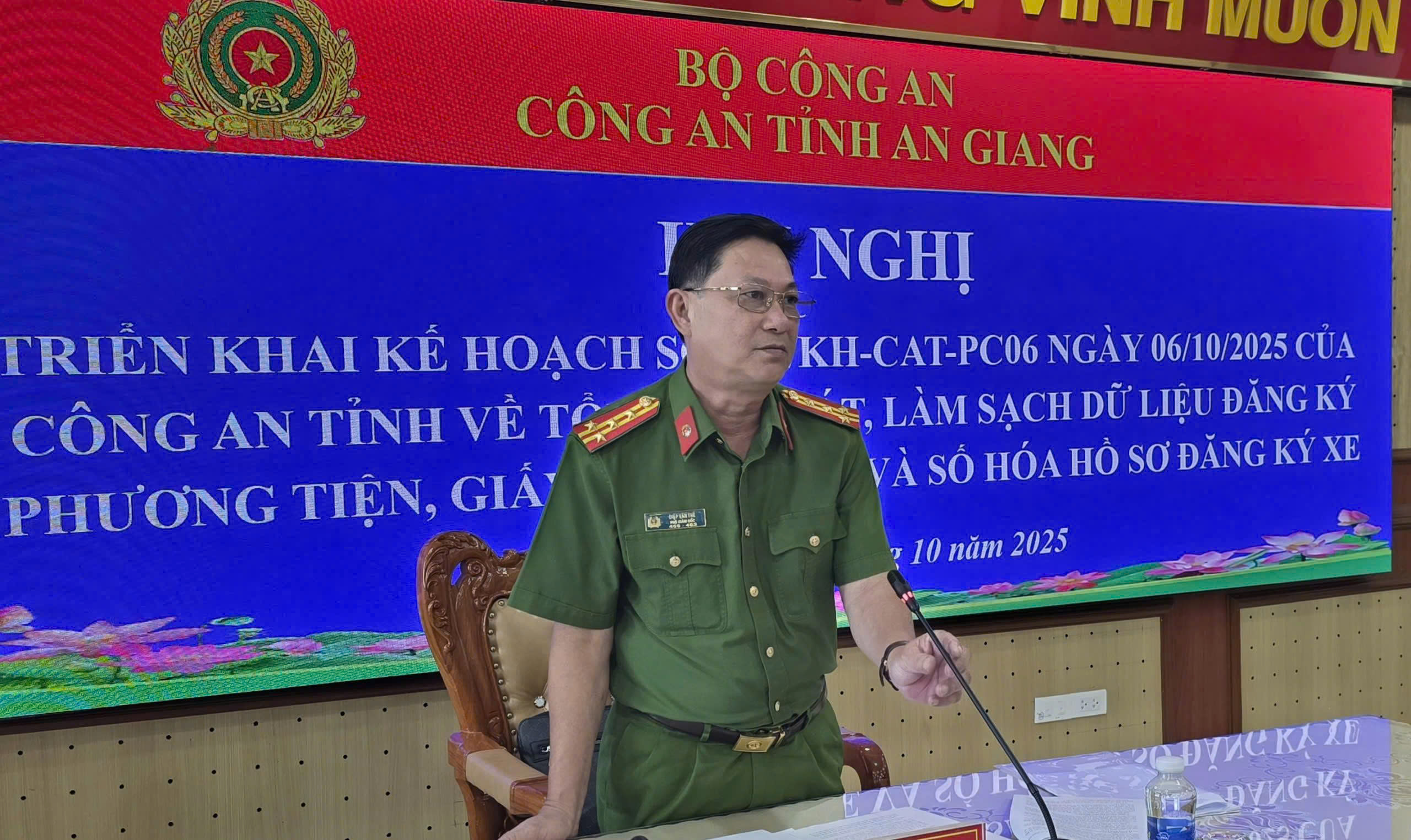 Chiều 09/10, Công an tỉnh An Giang tổ chức hội nghị trực tuyến đến Công an các xã, phường, đặc khu để triển khai Kế hoạch tổng rà soát, làm sạch dữ liệu đăng ký phương tiện, giấy phép lái xe (GPLX) và số hóa hồ sơ đăng ký xe trên địa bàn tỉnh. Đại tá Diệp Văn Thế, Phó Giám đốc Công an tỉnh, dự và chỉ đạo hội nghị.