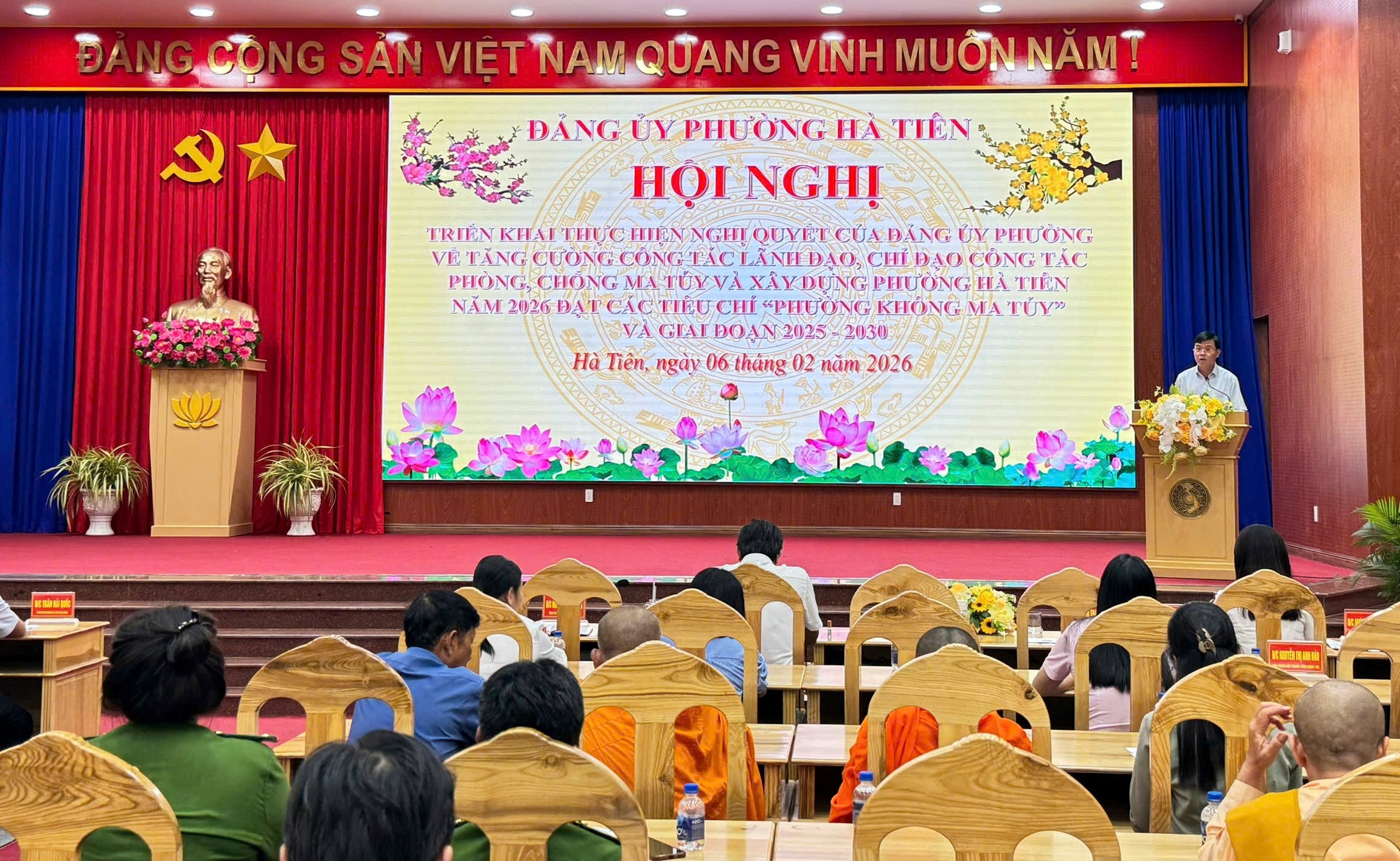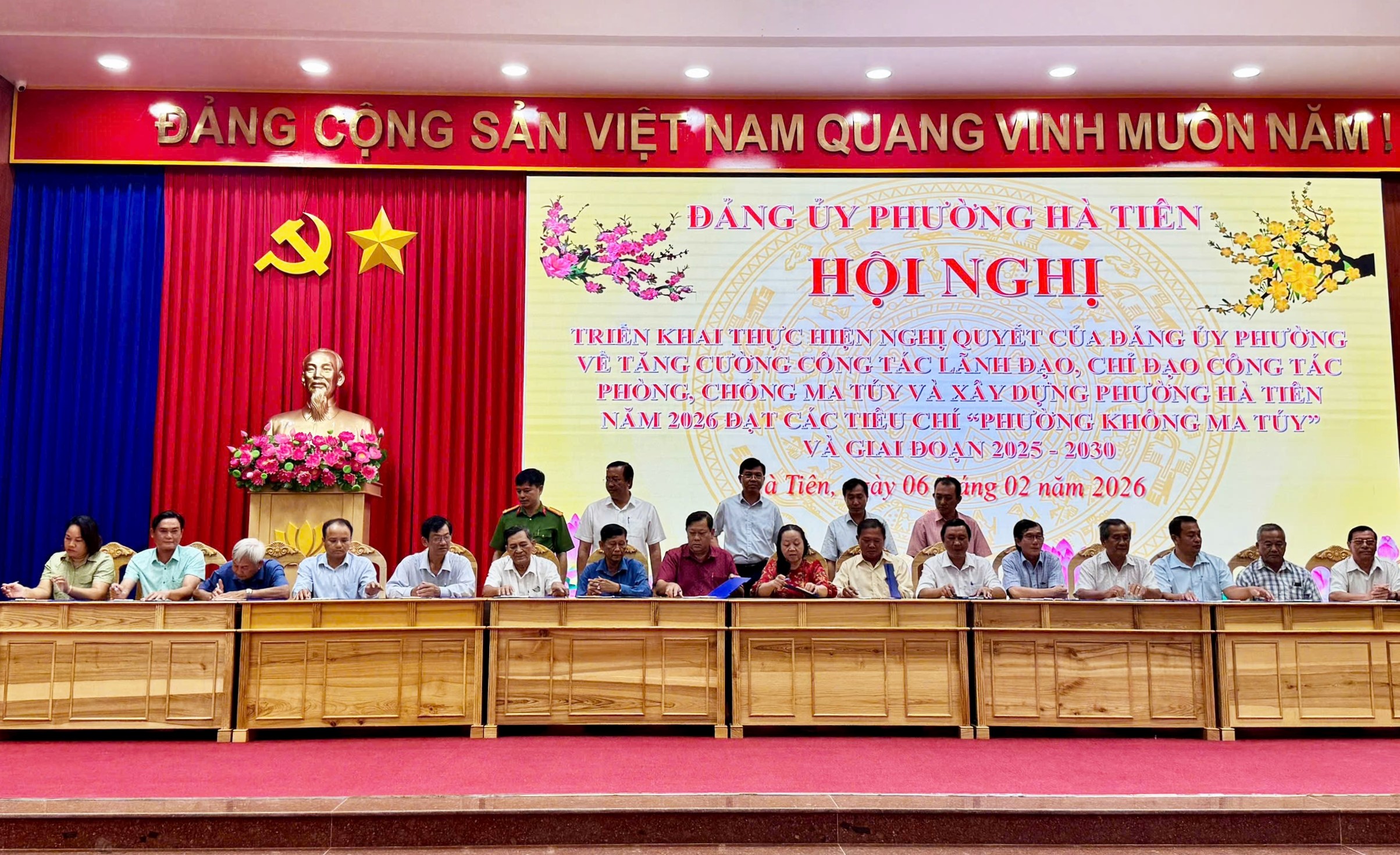 Đảng ủy – UBND phường Hà Tiên vừa tổ chức Hội nghị triển khai Nghị quyết và Kế hoạch xây dựng “Phường không ma túy” năm 2026 và giai đoạn 2025–2030. Đồng chí Nguyễn Lưu Trung, Tỉnh ủy viên, Bí thư Đảng ủy phường Hà Tiên chủ trì Hội nghị. Tham dự Hội nghị có đồng chí Thượng tá Lê Đức An, Trưởng Công an phường Hà Tiên, cùng đại diện các cơ quan, đơn vị liên quan.