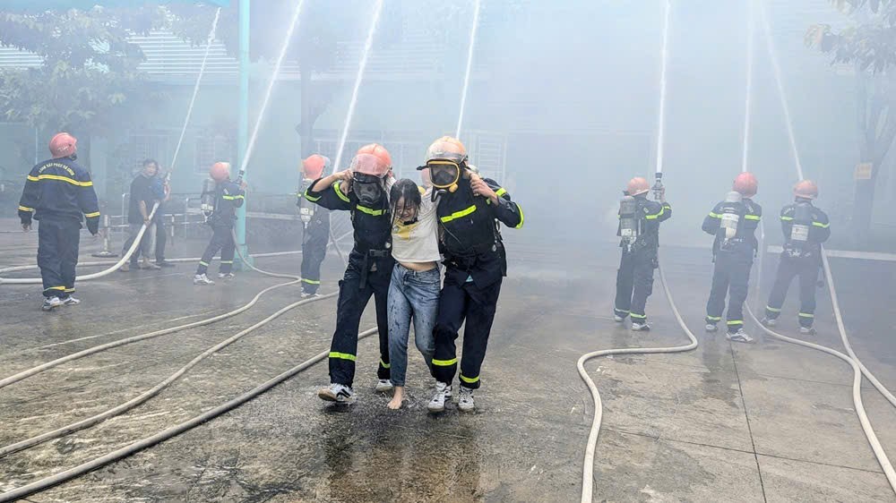 Nhận được tin báo cháy, Tổ chữa cháy và cứu nạn cứu hộ Mỹ Thới lập tức điều động 3 xe chữa cháy; 01 xe cứu nạn cứu hộ; 01 xe chỉ huy; 01 xe chở phương tiện, cùng hơn 35 cán bộ chiến sĩ nhanh chóng đến ngay hiện trường triển khai đội hình, phối hợp cùng lực lượng chữa cháy của Trung tâm Y tế tiến hành chữa cháy. Một nhóm dùng các vòi phun nước khống chế đám cháy và làm mát các tầng của tòa nhà chóng cháy lan, nhóm còn lại cứu người bị nạn còn kẹt bên trong thoát ra ngoài an toàn. Sau khoảng 15 phút phối hợp tích cực chữa cháy giữa các lực lượng, đám cháy giả định đã được dập tắt hoàn toàn, toàn bộ nạn nhân đã được cứu hộ thành công.