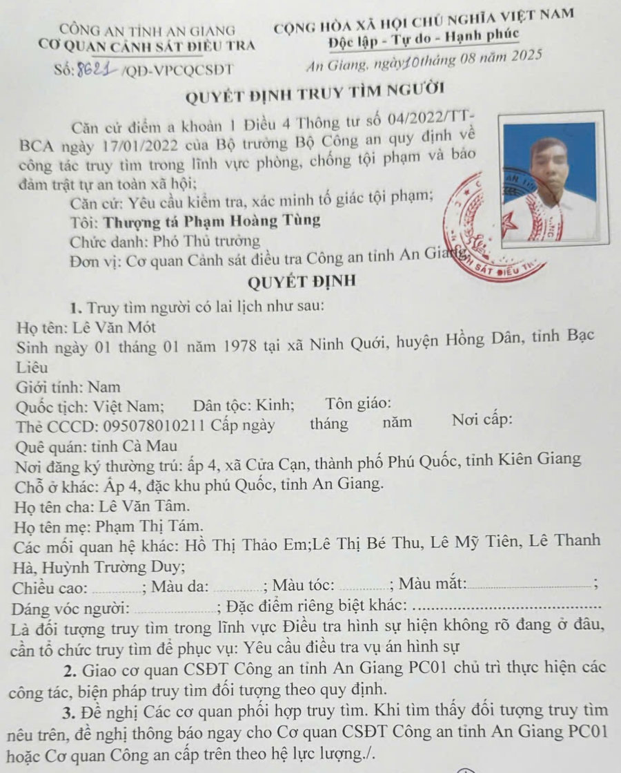 Ngày 15/8, Cơ quan Cảnh sát điều tra Công an tỉnh An Giang cho biết, đơn vị vừa ra Quyết định truy tìm đối tượng Lê Văn Mót, sinh năm 1978, cư trú xã Cửa Cạn, TP.Phú Quốc, tỉnh Kiên Giang (nay là đặc khu Phú Quốc, tỉnh An Giang) để phục vụ công tác giải quyết tin báo về tội phạm “Lừa đảo chiếm đoạt tài sản”.