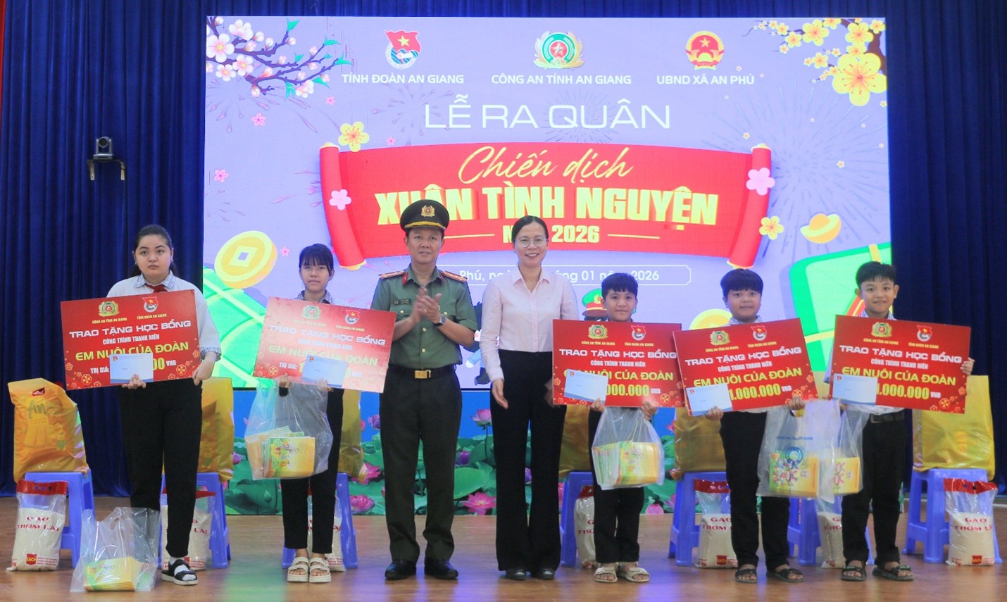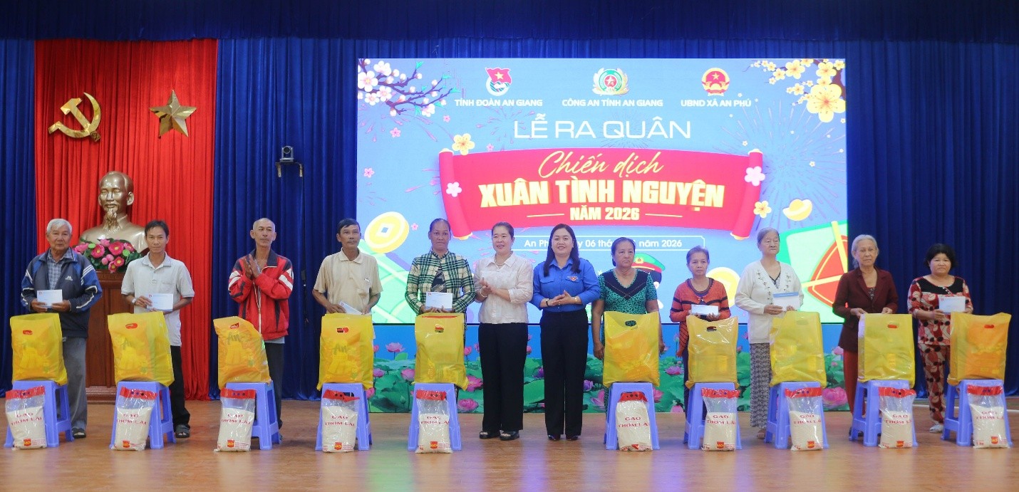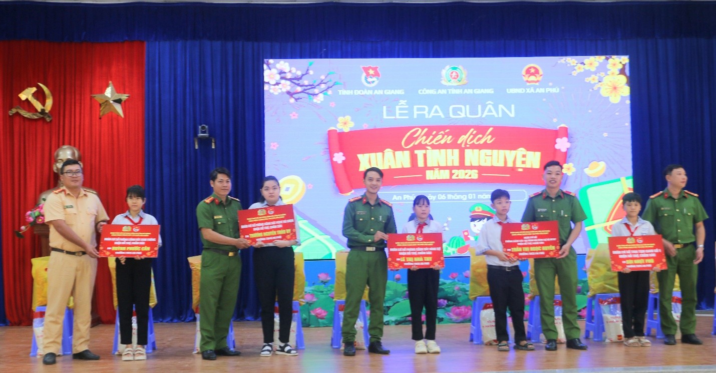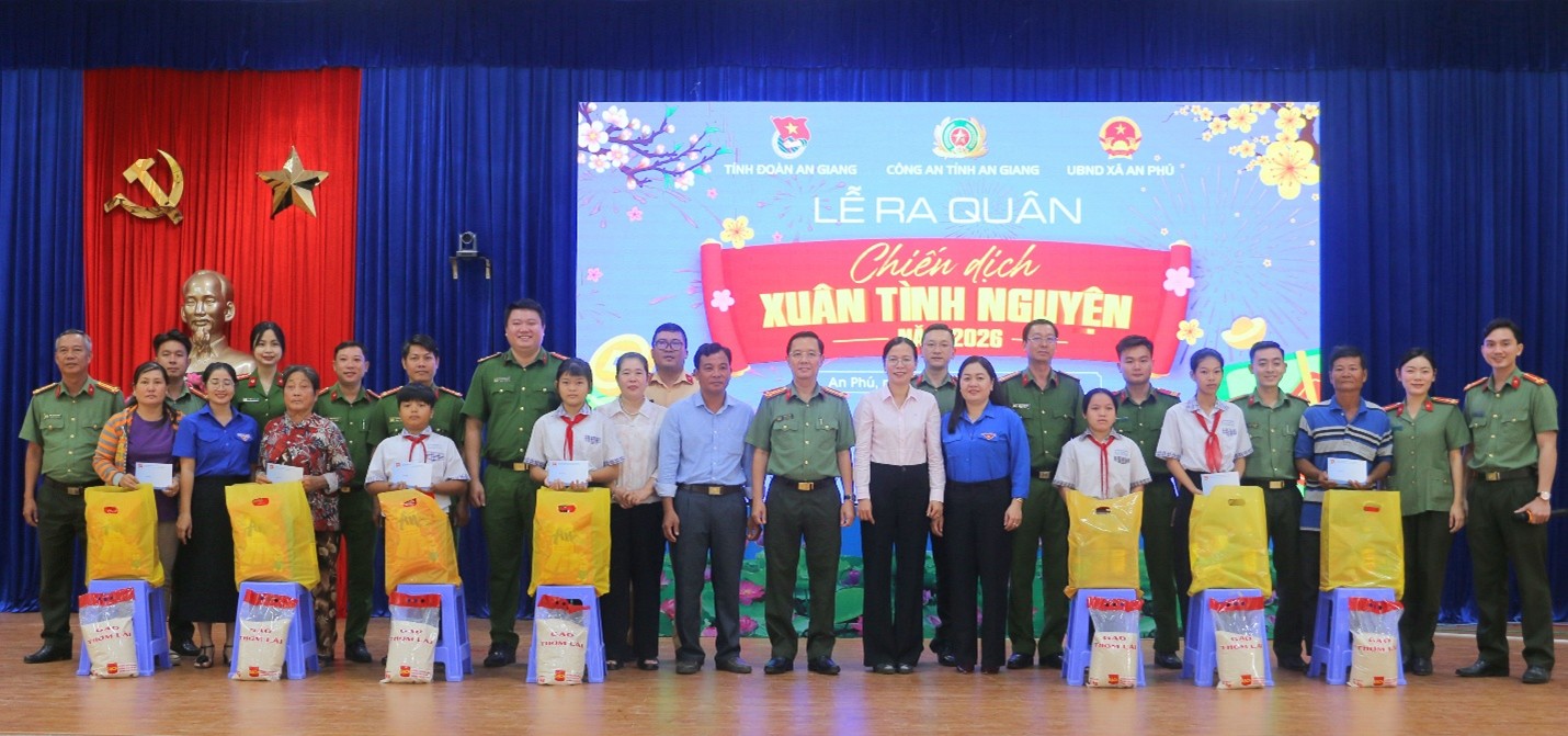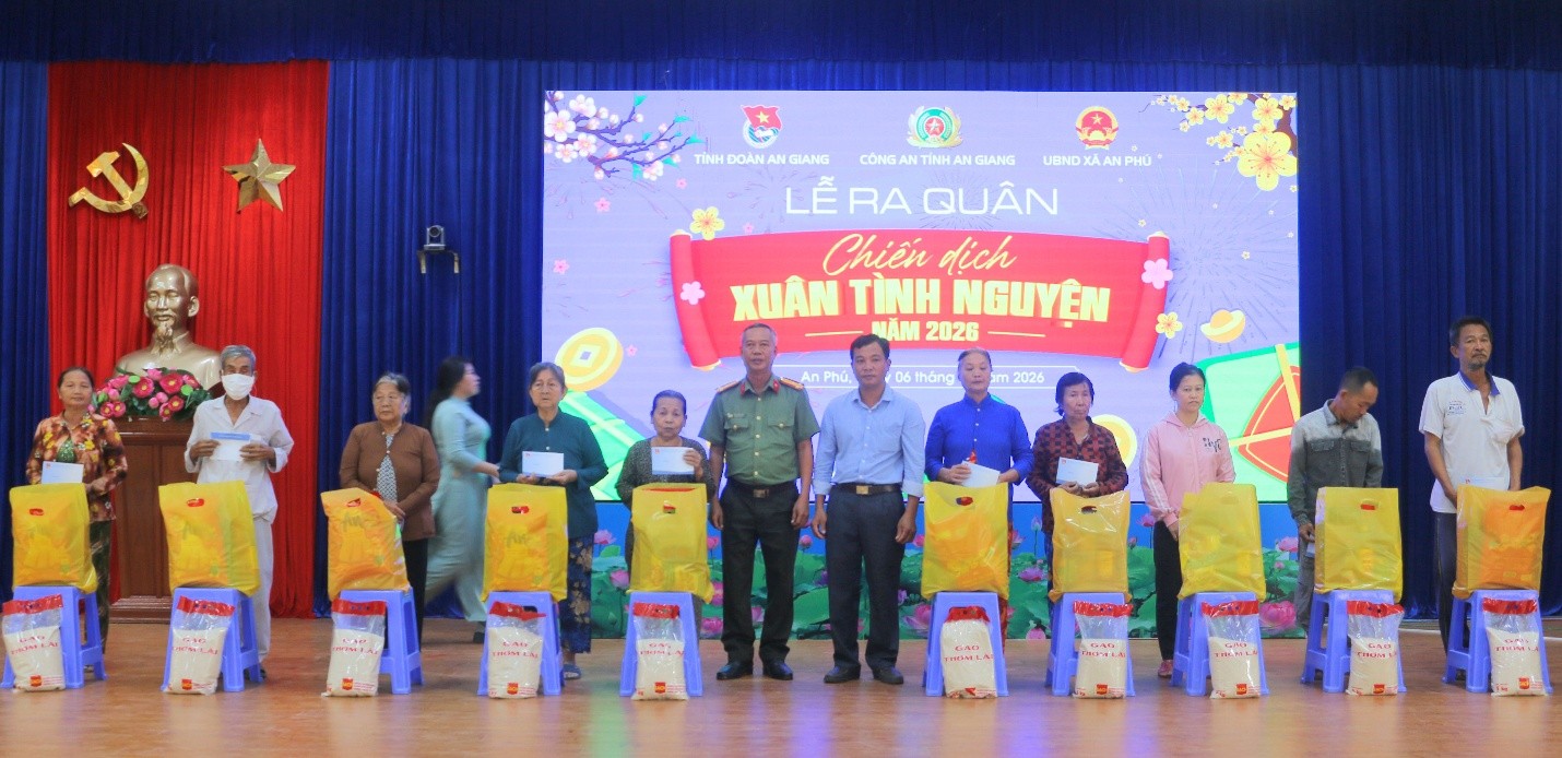 ‎ Sáng ngày 6/1/2026, tại xã biên giới An Phú, Công an tỉnh An Giang phối hợp với Tỉnh Đoàn An Giang và UBND xã An Phú (tỉnh An Giang) tổ chức Lễ ra quân “Xuân tình nguyện” năm 2026 với nhiều hoạt động thiết thực, ý nghĩa, góp phần giúp gia đình chính sách, hộ nghèo, hộ có hoàn cảnh khó khăn, các em học sinh vui Xuân, đón Tết vui vẻ, đầm ấm.