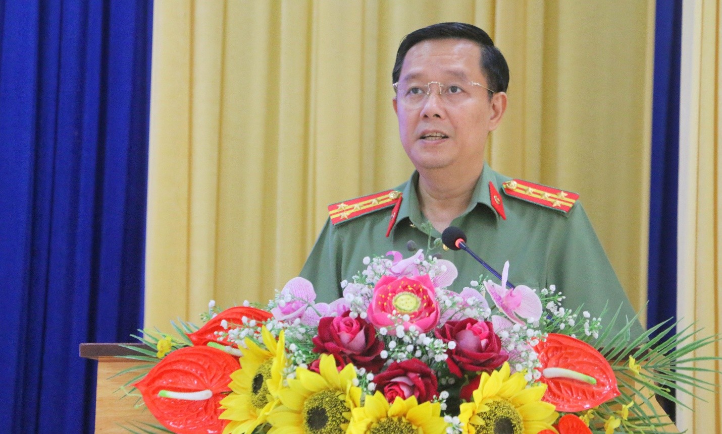 Đại tá Lê Phú Thạnh, Tỉnh uỷ viên, Phó Bí thư Đảng uỷ, Phó Giám đốc Công an tỉnh phát biểu tại buổi lễ.
