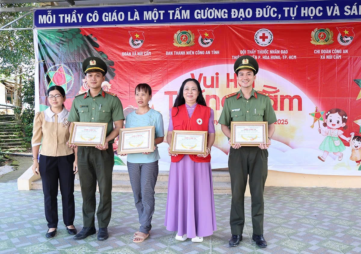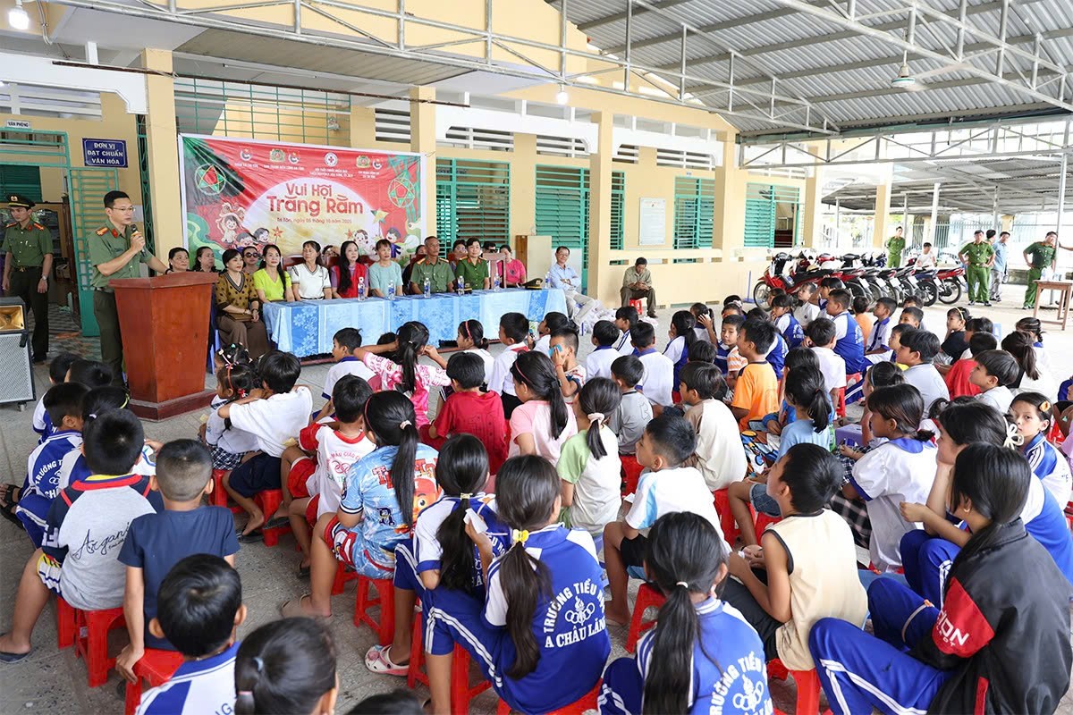 Tại Trường Tiểu học “A” An Hảo, thuộc xã Núi Cấm và Trường Tiểu học “A” Châu Lăng thuộc xã Tri Tôn, 300 suất quà, gồm lồng đèn, bánh kẹo, tập vở và viết… đã được cán bộ, chiến sĩ Công an tỉnh, các nhà hảo tâm và Ban Giám hiệu nhà trường trao tận tay các em nhỏ, giúp các em có một mùa Trung thu trọn vẹn, ấm áp yêu thương. Cũng nằm trong Chương trình, trước đó, tại các xã Vĩnh Bình, Vân Khánh và An Cư, tỉnh An Giang, tuổi trẻ Công an tỉnh tổ chức Chương trình “Vui hội trăng rằm” và trao tặng 450 suất quà cho các em có hoàn cảnh khó khăn vùng sâu, vùng xa, biên giới và trong vùng đồng bào dân tộc. Tổng kinh phí cho Chương trình lần này là 150 triệu đồng.