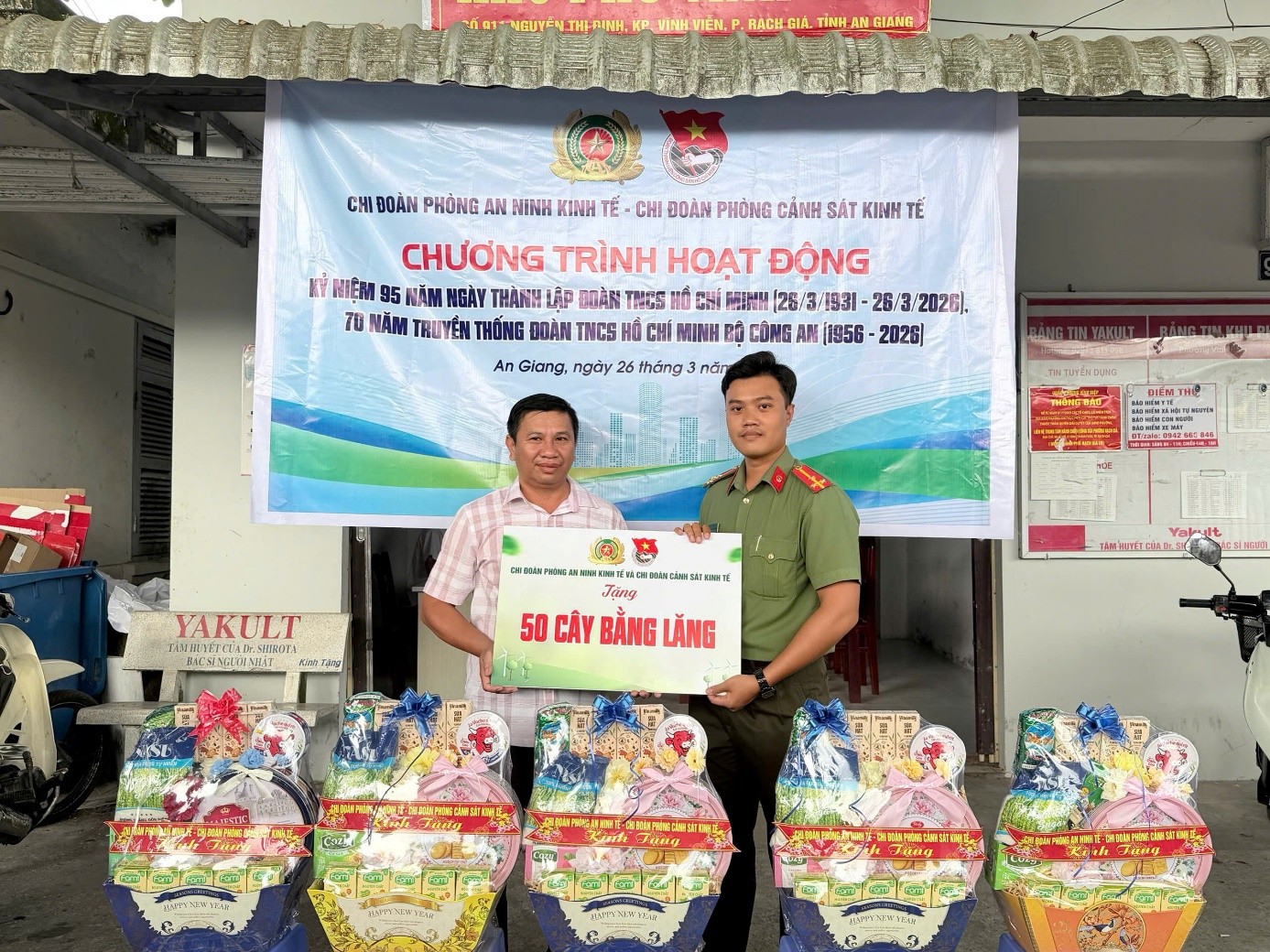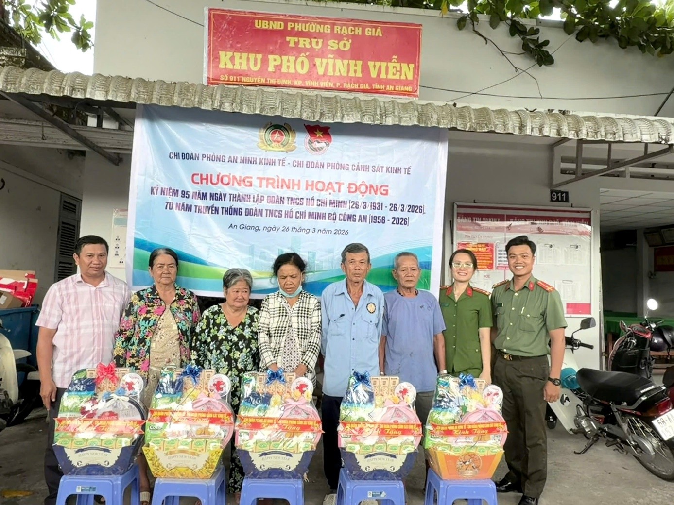 Chuỗi hoạt động bao gồm: Trao tặng 10 suất quà cho các hộ gia đình chính sách, hộ gia đình có hoàn cảnh khó khăn trên địa bàn khu phố Vĩnh Viễn, phường Rạch Giá. Cũng nhân dịp này, Chi đoàn Phòng An ninh kinh tế và Chi đoàn Phòng Cảnh sát kinh tế đã trao tặng 50 cây bằng lăng cho khu phố Vĩnh Viễn với mong muốn góp phần xây dựng cảnh quan môi trường xanh – sạch – đẹp, tạo bóng mát, cải thiện môi trường sống, qua đó nâng cao ý thức của người dân trong việc bảo vệ môi trường, xây dựng đô thị văn minh.
