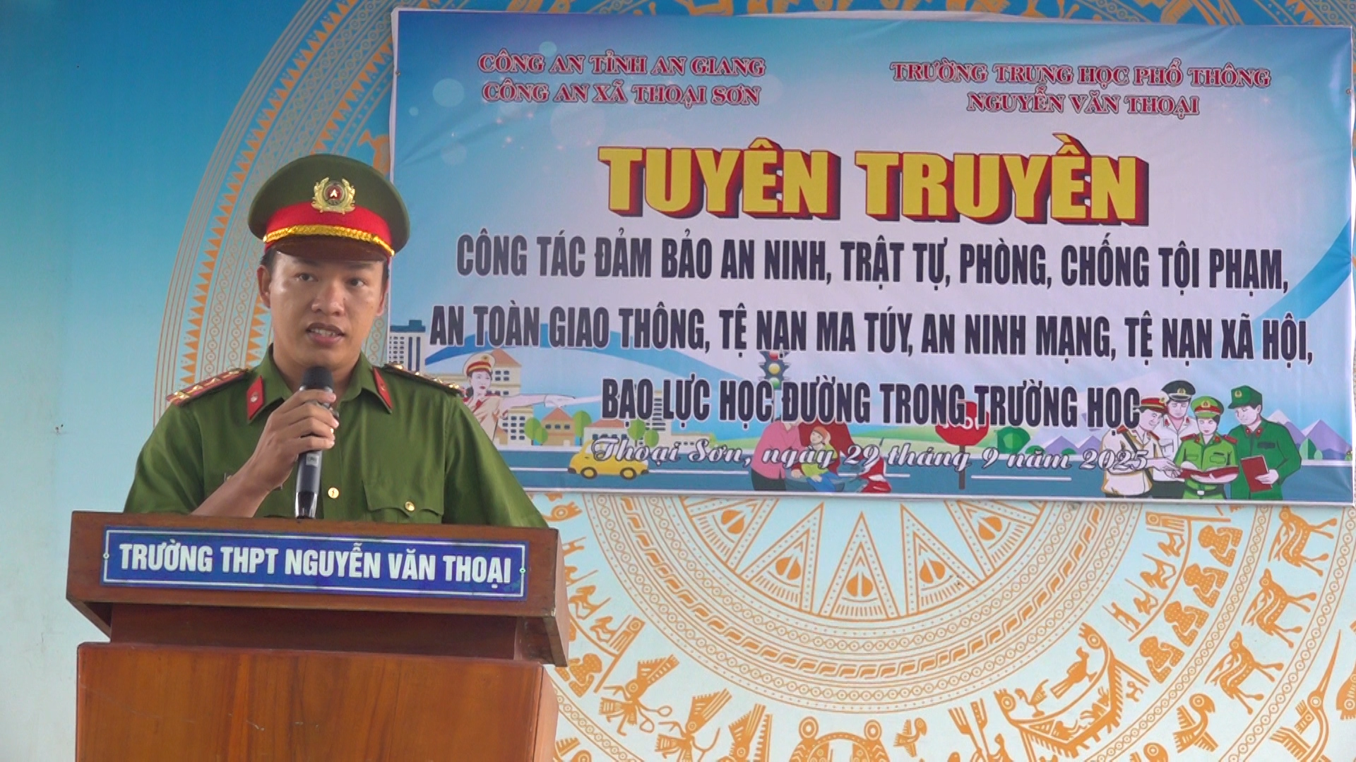 ‎Ngày 29/9/2025, tại Trường THPT Nguyễn Văn Thoại, Công an tỉnh An Giang phối hợp cùng Công an xã Thoại Sơn và Ban Giám hiệu nhà trường tổ chức buổi tuyên truyền chuyên đề về công tác đảm bảo an ninh trật tự, phòng, chống tội phạm, an toàn giao thông, phòng ngừa ma túy, an ninh mạng, tệ nạn xã hội và bạo lực học đường. Tham dự buổi tuyên truyền có đại diện lãnh đạo Công an tỉnh, cán bộ, chiến sĩ Công an xã Thoại Sơn, tập thể cán bộ, giáo viên cùng đông đảo học sinh. Đây là hoạt động thiết thực nhằm nâng cao ý thức trách nhiệm của học sinh, đoàn viên thanh niên trong việc chấp hành pháp luật, xây dựng môi trường học đường an toàn, lành mạnh.