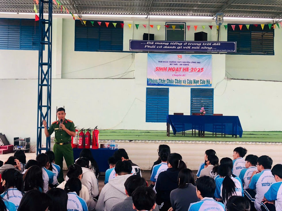 Phòng Cảnh sát phòng cháy, chữa cháy và cứu nạn, cứu hộ (PCCC và CNCH) Công an tỉnh An Giang phối hợp với Trường THPT Nguyễn Công Trứ tổ chức tuyên truyền, hướng dẫn kiến thức, kỹ năng PCCC và CNCH cho giáo viên, học sinh của trường tại khóm Trung Hưng, Mỹ Thới, An Giang.