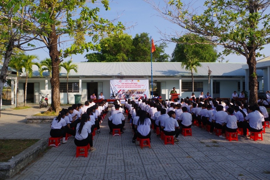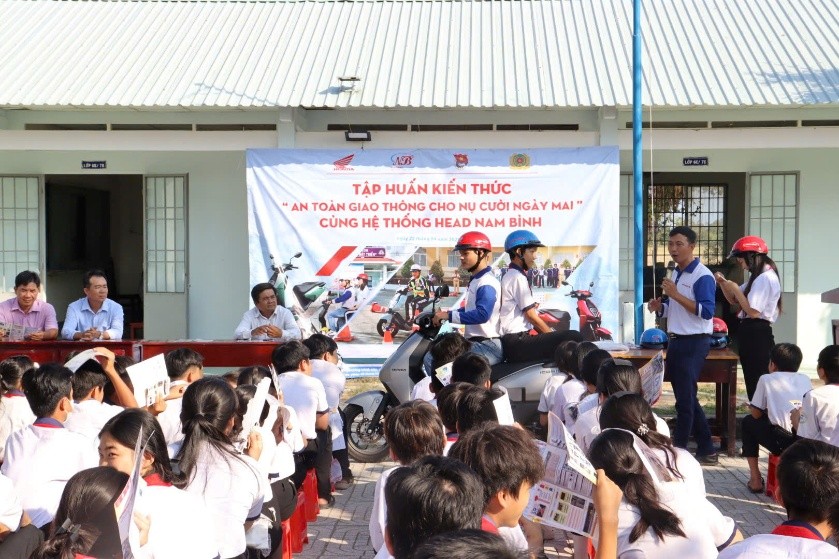 Nhằm góp phần phòng ngừa tai nạn giao thông từ sớm, từ xa trong lứa tuổi học sinh, sáng ngày 22/4/2026, Tổ Cảnh sát trật tự Công an xã Vĩnh Bình phối hợp với HEAD Nam Bình tổ chức buổi tuyên truyền pháp luật về TTATGT đường bộ cho gần 350 cán bộ, giáo viên và học sinh Trường Tiểu học, Trung học cơ sở Vĩnh Bình Nam (ấp Bình Phong, xã Vĩnh Bình, tỉnh An Giang).