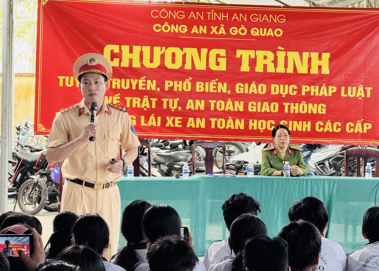 Nhằm nâng cao nhận thức và ý thức chấp hành pháp luật về bảo đảm trật tự, an toàn giao thông, đồng thời trang bị những kỹ năng cần thiết khi tham gia giao thông cho học sinh, ngày 01/4, Công an xã Gò Quao đã phối hợp với Phòng Cảnh sát giao thông Công an tỉnh tổ chức buổi tuyên truyền, phổ biến giáo dục pháp luật về trật tự, an toàn giao thông và kỹ năng lái xe an toàn tại Trường Trung học cơ sở Gò Quao. Buổi tuyên truyền có sự tham dự của 860 cán bộ, giáo viên và học sinh nhà trường.