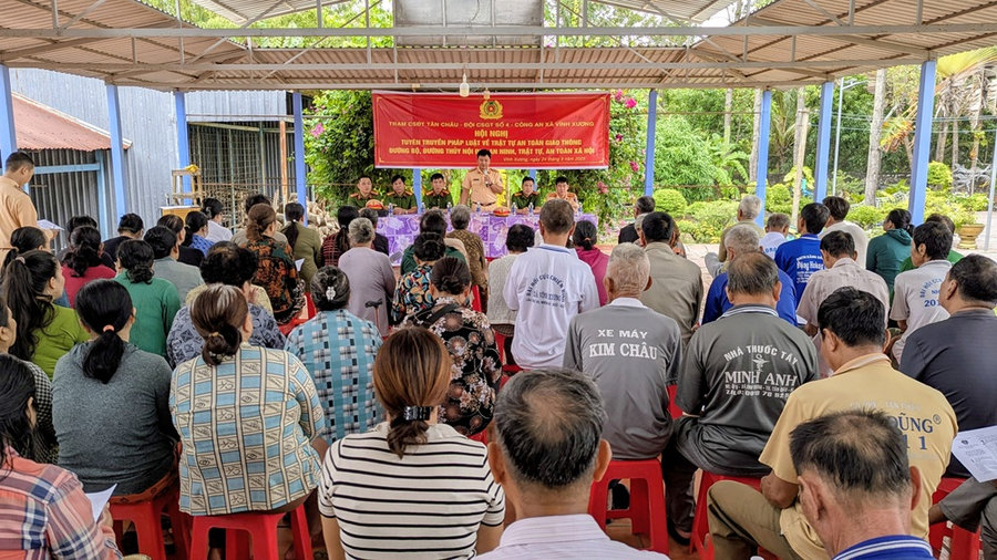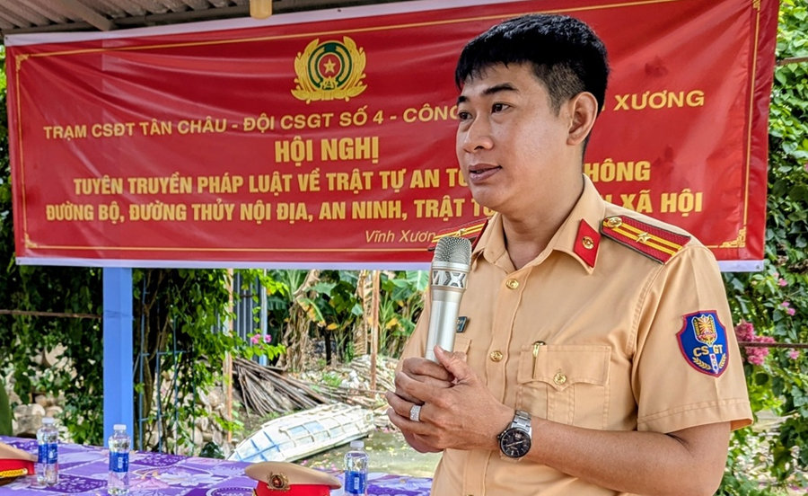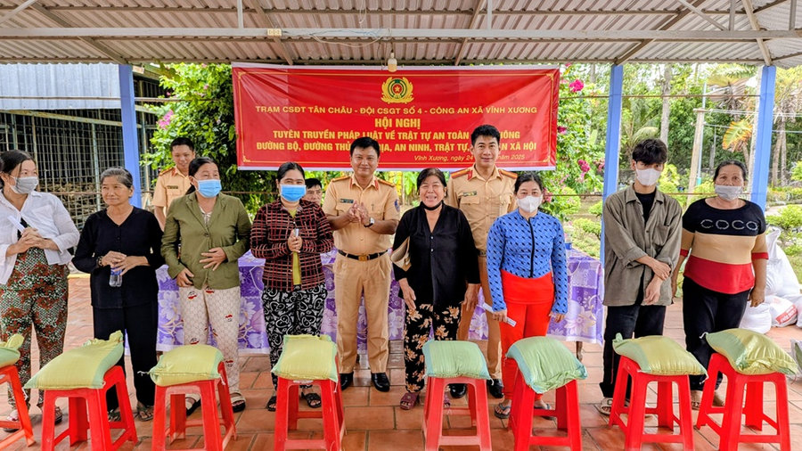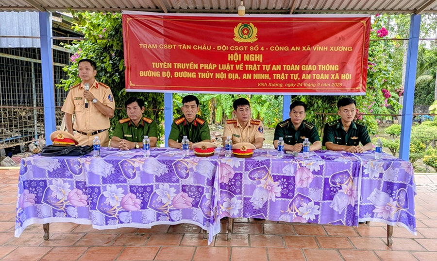 Ngày 24/9/2025, tại xã biên giới Vĩnh Xương, tỉnh An Giang, Trạm Cảnh sát đường thủy Tân Châu; Đội Cảnh sát giao thông số 4 (thuộc phòng Cảnh sát giao thông Công an tỉnh) phối hợp Công an xã Vĩnh Xương và Đồn Biên phòng Cửa khẩu quốc tế Vĩnh Xương tổ chức hội nghị Tuyên truyền pháp luật về trật tự an toàn giao thông đường bộ; đường thủy nội địa; an ninh trật tự, an toàn xã hội cho gần 100 người dân trên địa bàn xã.
