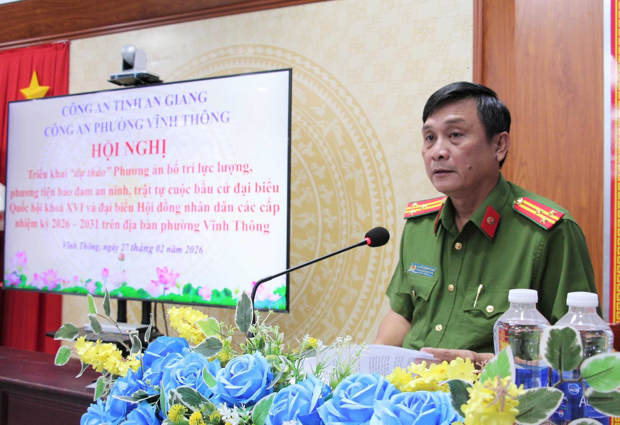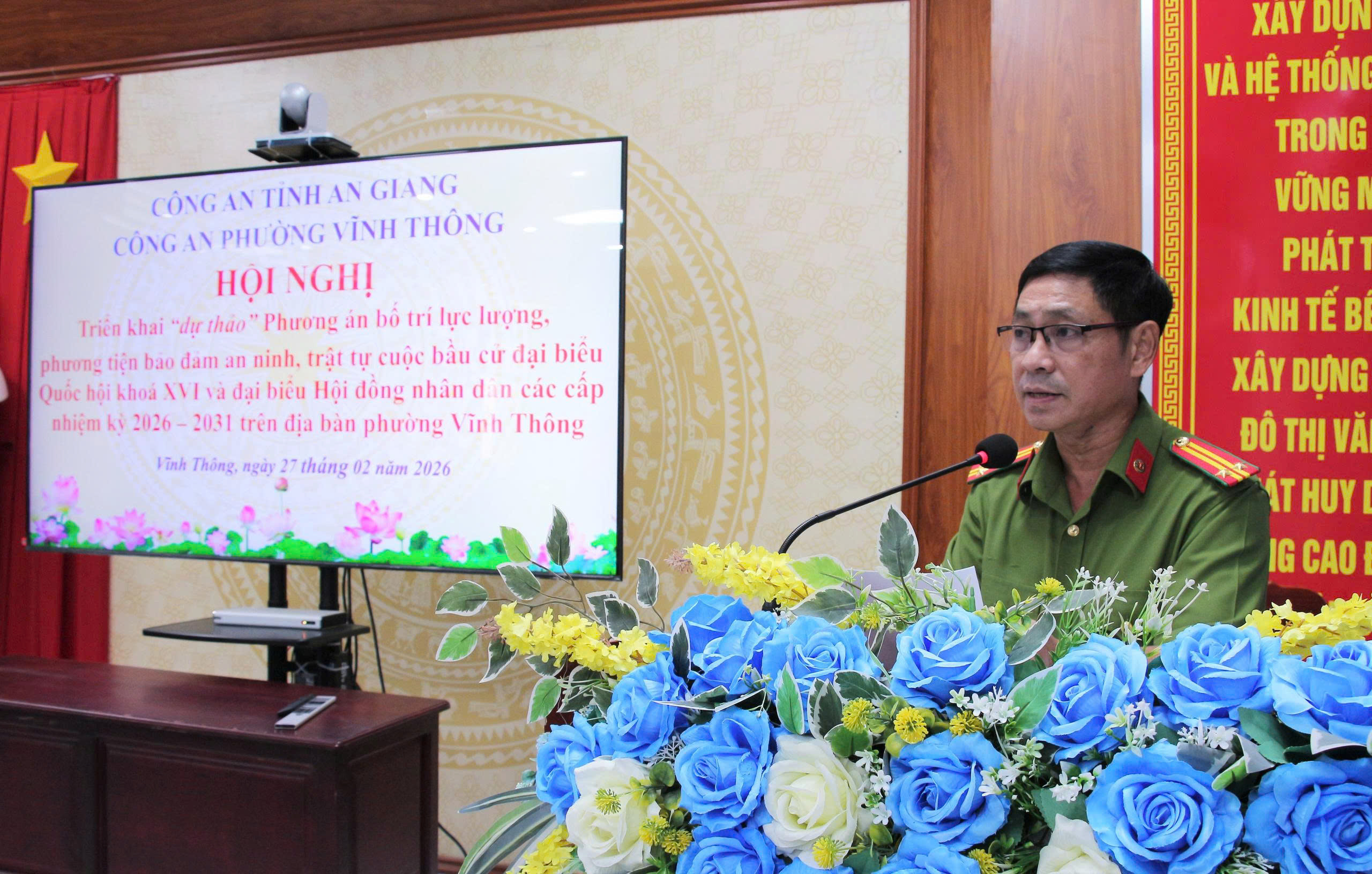 Ngày 27-02, Công an phường Vĩnh Thông tổ chức Hội nghị triển khai “Dự thảo” Phương án bố trí lực lượng, phương tiện bảo đảm an ninh, trật tự cuộc bầu cử đại biểu Quốc hội khóa XVI và đại biểu Hội đồng nhân dân các cấp nhiệm kỳ 2026-2031 trên địa bàn phường (gọi tắt là Phương án bảo đảm ANTT).